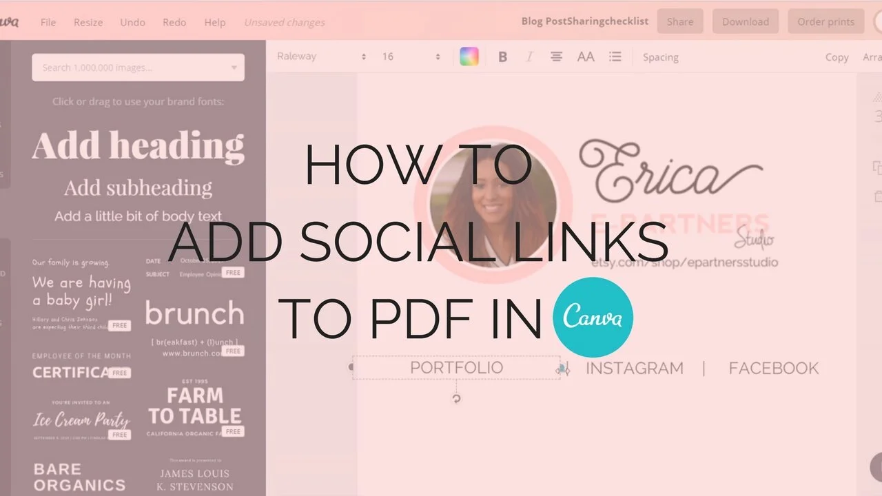 Have you ever wondered how to add a clickable link to a PDF form inside of Canva? In the tutorial below I show you how to add social media links inside a PDF. This is a great feature to add to your Worksheet, Freebie, Lead Magnet or Client Welcome packet. As an added bonus you also learn how to add a link to a picture.https://youtu.be/AqVrpQwky7USorry the volume is so low on the video. It is something I am trying to fix.Let me know if you found this tutorial helpful.I'm a designer that loves Photoshop and Canva equally. The whole Adobe Creative Suite is amazing, but sometimes you want to quickly make something. Which one do you like more?Thanks for stopping by.Best,Erica